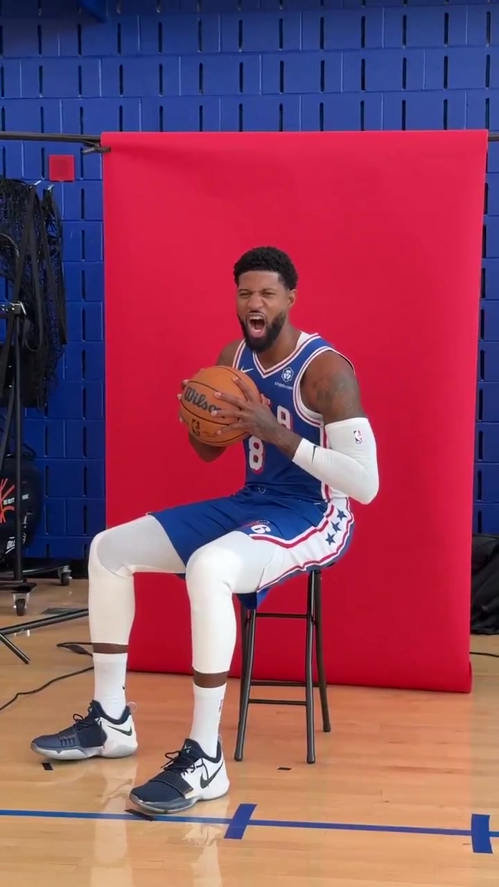 新赛季能回暖吗乔治出席76人媒体日拿球怒吼摆造型